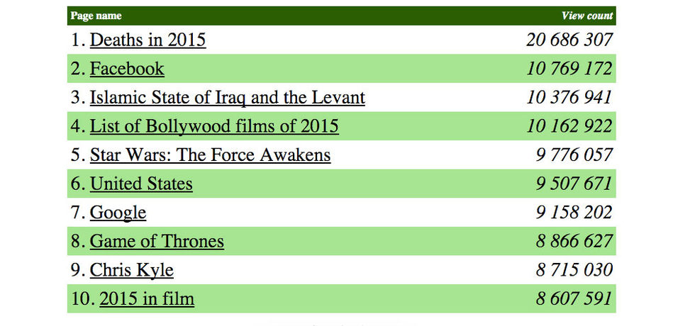 Wikimedia, organisationen som driver det globala uppslagsverket Wikipedia, har släppt statistik över vilka sidor som besöktes mest under året i respektive land och här i Sverige var de populäraste sidorna "Sverige", "Johan Falk (filmer)" och "Martin Beck (filmer)".För engelskspråkiga Wikipedia var de tre mest besökta sidorna under 2015 "Deaths in 2015", "Facebook" samt "Islamic State of Iraq and the Levant". Ni kan kolla in de svenska respektive engelska topp-tio-listorna ovan respektive nedan. Under "Läs mer" hittas de 100 mest besökta Wikipediasidorna på svenska Wikipedia för 2015 och hoppar ni vidare på länken kan ni kolla in topp-100-listor för engelskspråkiga och andra länders Wikis.