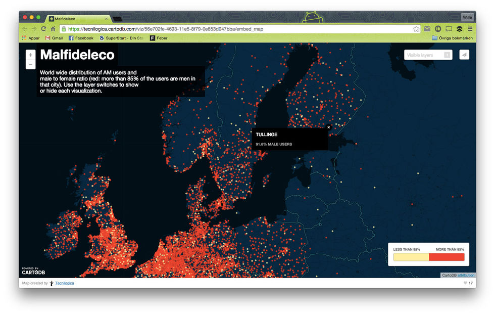 Efter det att otrohetssajten Ashley Madison hackades förra månaden och fick data om 32 miljoner av tjänstens användare läckta på nätet har det nu varit möjligt att ta fram statistik över hur könsfördelningen ser ut på sajten.Någon eller några som kallar sig för Malfideleco har tagit den läckta användardatan från Ashley Madison och lagt in användarnas kön på en interaktiv karta så att man enkelt kan se hur könsfördelningen bland användarna ser ut runt om i världen. Man har satt en gräns vid när manliga användarna i en stad överstiger 85% av det totala användarantalet i en specifik stad och denna stad blir då rödmarkerad på kartan. Som synes så är det väldigt mycket rött och totalt ska antalet män vara 90% til 95% av sajtens användare skriver Gizmodo.Ni hittar den interaktiva kartan på länken nedan och där går det även att zooma in på specifika städer för att få den exakta procentsiffran för män som har registrerat sig på Ashley Madison i en stad.