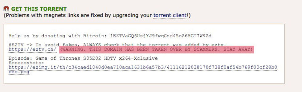 Den uppskattade torrentsajten EZTV, som framför allt varit kända för tillgång till tv-serier, meddelar nu att man lägger ner efter det att kriminella på bara några dagar mer eller mindre lyckats kapa hela deras verksamhet.Ni kan läsa hela den tragiska historien om EZTV borta hos TorrentFreak på länken nedan men det handlar om domäner som har kapats, mailkonton som har kapats och några olyckliga omständligheter som gjorde att EZTV:s grundare NovaKing helt tappade kontrollen över sitt livsverk.Istället för att försöka återta EZTV lägger man alltså nu ner rubbet. Samtidigt varnar (fd) EZTV, The Pirate Bay, KickassTorrents, BT-chat, Rarbg samt flera andra torrentsajter att EZTV:s före detta domäner nu drivs vidare av de som kapat verksamheten och uppmanar alla att hålla sig borta från allt EZTV-relaterat framöver om man vill undvika oönskad reklam och kanske även andra tråkigheter som virus och liknande.The Pirate Bay har stängt av EZTV:s konto på TPB men många torrents från EZTV ligger kvar och de är nu försedda med varningar liknande den nedan (röd markering tillagd av oss).