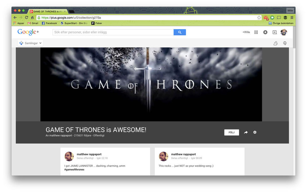 Googles sociala medie-tjänst Google+ lanserar idag något som man kallar för "Samlingar" (Collections) vilket är en slags Pinterestliknande funktion.Med Samlingar kan Google+-användaren välja att gruppera inlägg, foton, videofilmer och annat i en särskild kategori som man kan namnge och ge en egen omslagsbild (se exempel nedan). Har man skapat en samling så kan man direkt gruppera nya inlägg i denna i samband med att man göra nya inlägg på Google+. Samlingar kan givetvis följas på samma sätt som användare och grupper om man skulle hitta en samling man är intresserad av.Vill du skapa en egen Samling så hoppa vidare på länken nedan och vill du kolla in några samlingar som redan är skapade så listas ett gäng här.