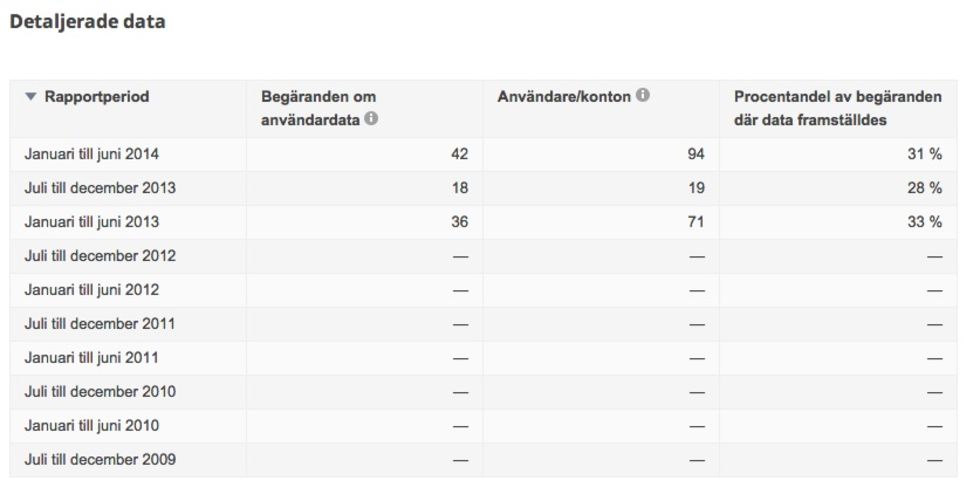 Igår släppte Google för tionde gången sin så kallade "Transparency Report" där man redovisar krav på att lämna ut information om sina användare till diverse länder.Enligt Google har dessa krav ökat 15% under den senaste sexmånaders-perioden och hela 150% sen man började redovisa inkomna krav från diverse stater 2009. För USA, som står för majoriteten av kraven, var dessa siffror 19% respektive 250%. För Sveriges del begärdes information ut 42 gånger från Google under den senaste sexmånaders-perioden. I 31% av de fallen lämnade Google ut data till Sverige. Ni kan se statistik för Sverige på bilden nedan.