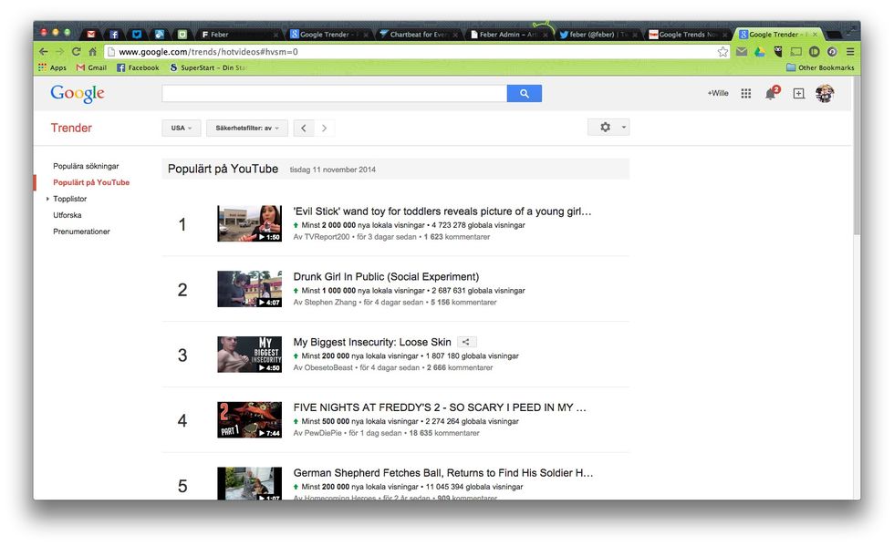 Har man tröttnat att surfa runt på klicksajter och i sociala medier för att hitta roliga videoklipp har Googles statistiktjänst Google Trends nu börjat visa vilka filmer som trendar på YouTube.För tillfället baseras statistiken på amerikanska tittares vanor men man säger att fler länder kommer att dyka upp som alternativ senare. På topplistan visas hur många visningar klippet fått, när det laddades upp till YouTube, vem som laddade upp klippet samt hur många kommentarer klippet har.Det går även att lista videos i "säkert" eller "osäkert" läge och som ni kan se på skärmdumparna här blir resultatet rätt annorlunda beroende på vilket läge man väljer.