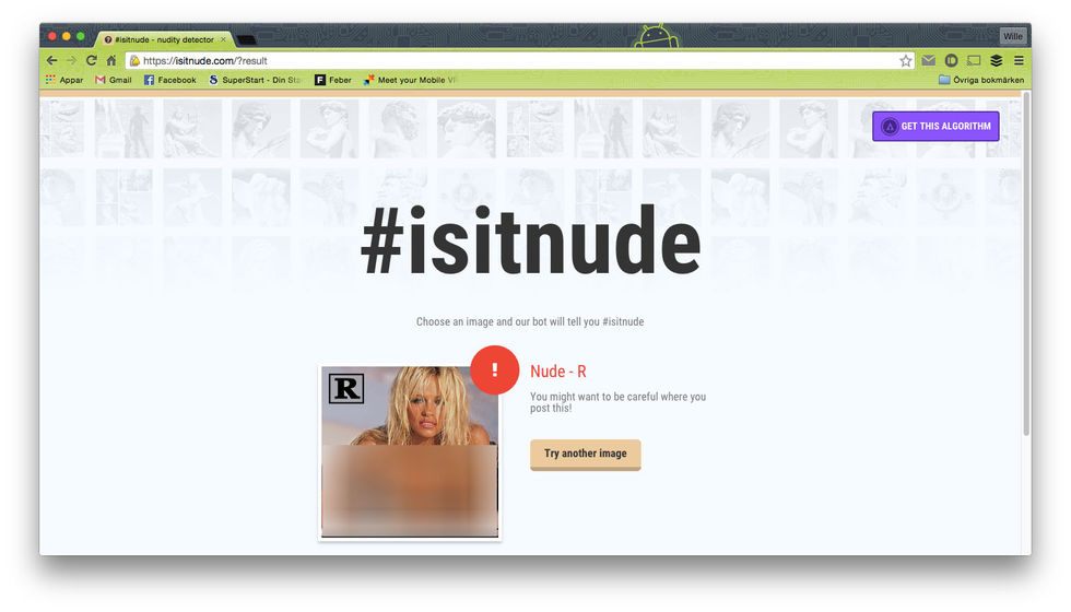 IsItNude är en webbtjänst där man kan ta reda på om en algoritm anser att en bild man laddar upp till tjänsten ska anses som naken eller inte.Det är utvecklare till Algorithmia som tagit fram tjänsten och den algoritm som genom att analysera hur mycket hudfärgade delar som finns i fotografiet bestämmer huruvida bilden ska klassas som NSFW eller inte. Det ska dock sägas att algoritmen inte är helt perfekt och en del NSFW-bilder jag testade passerade som godkända (Ja, det är sådant jag får göra när ni andra har semester).Utvecklarna bakom "Nudity Detection"-algoritmen säger att den är långt ifrån perfekt än så länge men att man utvecklar den hela tiden. Skulle man vilja använda algoritmen på sin egen webbtjänst eller app så kan man göra det via Algorithmia här. Bild blurrad efter test.