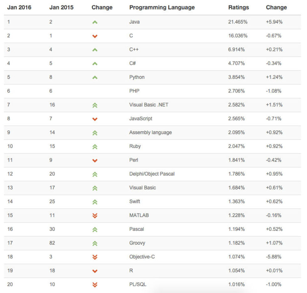 Det förhållandevis rätt gamla programmeringsspråket Java tog hem titeln som förra årets populäraste programmeringsspråk enligt företaget Tiobe som varje månad rankar olika programmeringsspråk efter deras popularitet.Tiobe säger att man i sitt "Programming Community index" bland annat tar hänsyn till variabler som hur många som använder språket, hur många kurser det anordnas, hur många företag som erbjuder språket i sitt produktutbud samt hur ofta språken eftersöks i några av världens största sökmotorer.Näst populäraste programmeringsspråk 2015 var C och därefter hittas C++, två språk som är ännu äldre än vad Java är. Nedan hittas hela topp-20-listan för Tiobe Programming Community index.