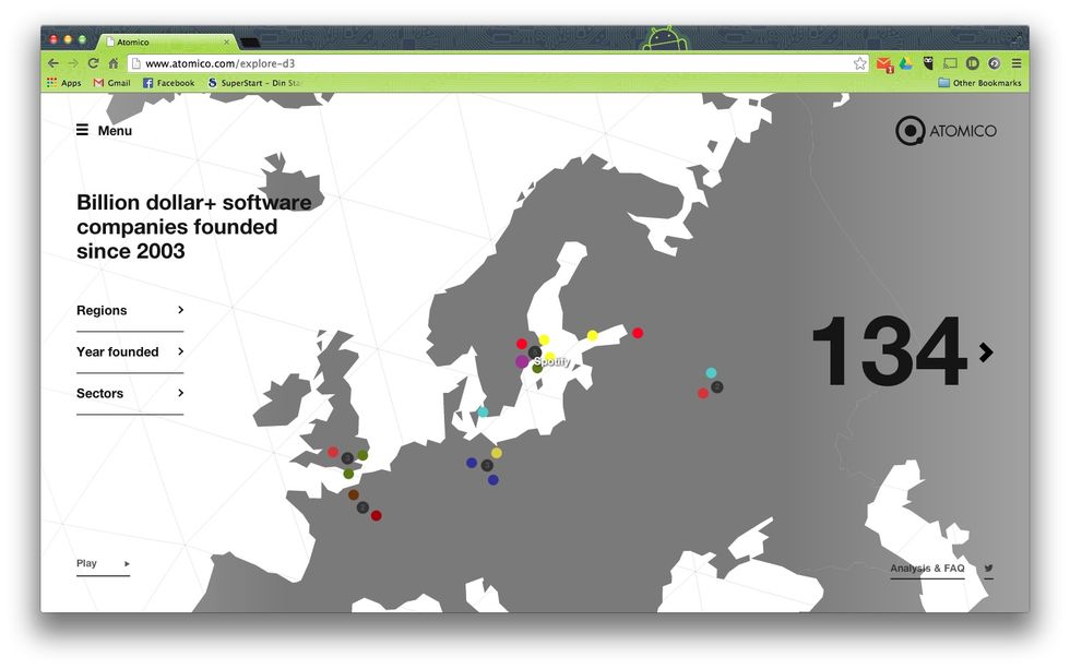 Skypegrundaren Niklas Zennströms riskkapitalbolag Atomico har gjort en sammanställning över 134 mjukvaruföretag som grundats sedan 2003 och idag är värderade till en miljard dollar eller mer.60 av företagen är inte helt oväntat grundade på den amerikanska västkusten med Silicon Valley som den absoluta hotspotten där 52 av de 134 företagen grundades. I Sverige finns det fem stycken mjukvaruföretag som värderas till över en miljard dollar och de är alla grundade/baserade i Stockholm.De fem företagen som fått representera Sverige är Skype, Mojang, Klarna, Spotify samt King.com.