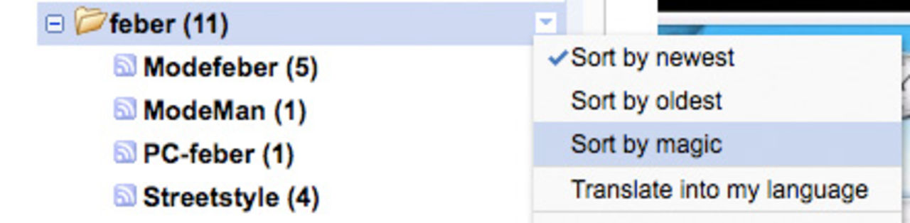 För oss som gillar RSS blev den, i mitt tycke, bästa RSS-läsaren ännu bättre när Google Reader nu introducerar något som man kallar "Sort by magic". Enkelt förklararat innebär det att rss-inläggen ej listas kronologiskt utan istället efter hur viktiga Google Reader tror att användaren tycker att inläggen är.Rankingen på inläggen bestäms via hur användaren har gillat, delat och stjärnmärkt tidigare RSS-inlägg. Sen finns det säkert några variabler till bakom kulisserna som vi inte riktigt känner till.Sort by magic funkar bäst om man snabbt vill läsa de inläggen som antagligen har högst relevans för just dig. Nackdelen är givetvis att man kan missa något viktigt som inte Google anser är intressant för just dig.