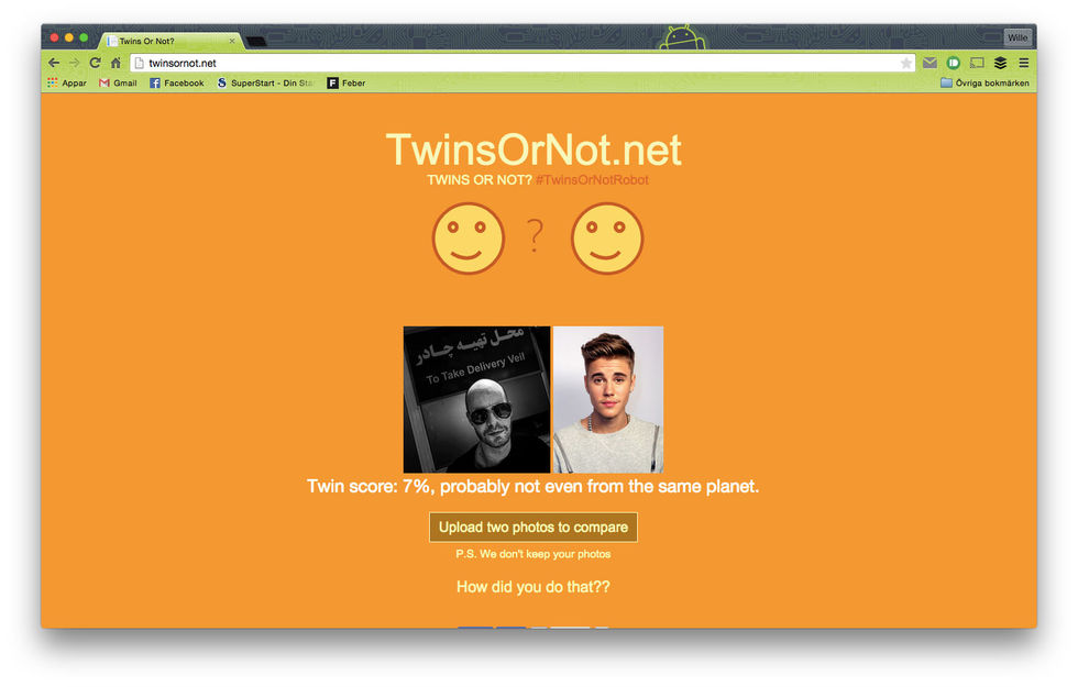 För ett tag sedan släppte Microsoft tjänsten "How-old.net" vilket var en tjänst som försökte bestämma åldern på en person i ett fotografi.Nu har Microsoft byggt vidare på sin bildanalys-mjukvara och dragit igång tjänsten "TwinsOrNot.net" där man ska ladda upp bilder på två personer och sedan analyserar och avgör tjänsten hur lika personerna på bilden faktiskt är.Jag testade tjänsten med en bild på mig själv samt bilder på två olika kändisar. Blev rätt så nöjd med resultatet.