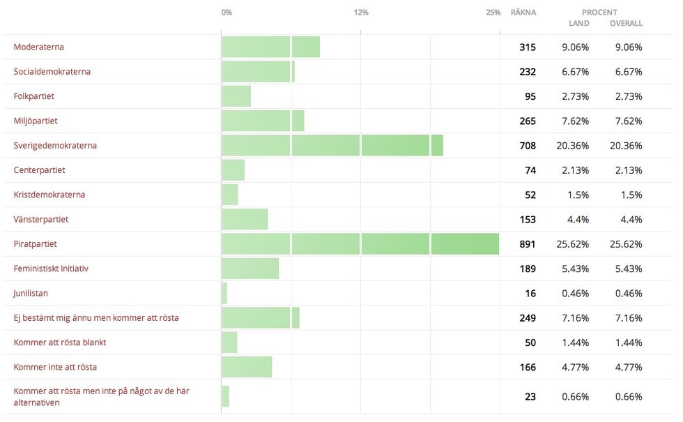 Igår var det val till EU och efter att i stort sett alla röster har räknats ser det ut som förra valets överraskning, Piratpartiet (PP), förlorar sina båda mandat i EU-parlamentet.Enligt det preliminära valresultatet får PP 2,2% av rösterna vilket är långt ifrån de fyra procent som krävs för att säkra en plats i EU-parlamentet. Bland de partier som gjorde ett bättre valresultat jämfört med förra valet hittas F!, V, SD, KD, C samt MP medan Socialademokraterna backat marginellt, Folkpartiet backat lite mera och Moderaterna gjorde ett katastrofval.I diagrammet ovan hittas det preliminära valresultatet för det svenska EU-valet och i diagrammet nedan hittar ni Feberläsarnas resultat från vår egen, högst ovetenskapliga, valundersökning som vi genomförde vecka 20.