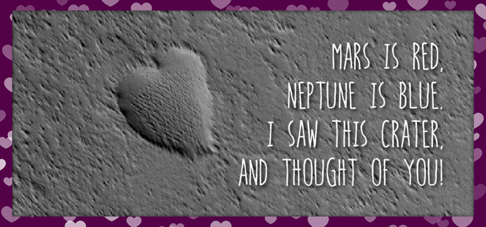 Även NASA satsar på Alla hjärtans dag i år och de har dragit ihop en tjänst där man kan välja mellan ett tiotal motiv som hittats på olika ställen på Mars som man kan skicka till sin hjärtevän.Det handlar om kratrar och andra formationer som ser ut som hjärtan som NASA har fotograferat på Mars som man kan välja mellan. Har man väl valt sitt motiv så är det bara att fylla i sitt eget namn och epost-adress samt den som ska få det och sedan skicka iväg. Passar säkert perfekt om ni har partners som är intresserade av rymden i allmänhet och Mars i synnerhet.