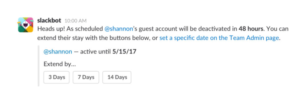 Kommunikationsverktyget Slack har fått en trevlig funktion som gör det lättare att bjuda in frilansare eller praktikanter till företagets konversationer. Gästkonton har funnits men nu kan administratörer sätta tidsbegränsning på dem vilket gör att man slipper fiffla med detta manuellt när personen slutar.Slack skickar även automatiskt ut en påminnelse att kontot kommer upphöra två dagar innan det gör det. Då kan administratörer enkelt välja att förlänga gästkontot om det behövs.Gästkonton kommer även ha lite mer information som visar folk hur länge kontot kommer vara aktivt och om det har tillgång till en kanal eller flera kanaler.