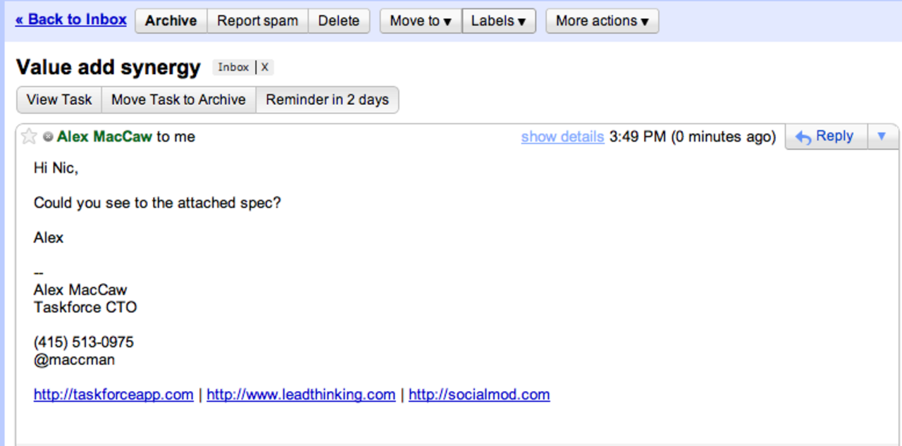 Taskforce är en plugin till webbläsarna Firefox och Chrome vars syfte är att hjälpa användare få lite bättre ordning och reda i sin inbox på Googles epost-tjänst Gmail.Bland annat finns det en "snooze"-knapp med vilken man kan konvertera ett mail till en uppgift (task) och därefter välja när man vill ta tag i uppgiften. Väljer man till exempel att bli påmind om två dagar så kommer mailet/uppgiften lägga sig i dvala för att efter två dagar åter igen ploppa upp i användarens inbox. Det är inte helt olikt pluginen Boomerang som vi skrev om för några dagar sedan.Taskforce befinner sig än så länge i sluten beta men vill man ha en inbjudan så säger utvecklarna bakom tjänsten att det inte är helt omöjligt att man får en sådan om man börjar följa företaget på Twitter. Det går även att ansöka om en inbjudan på företagets hemsida.