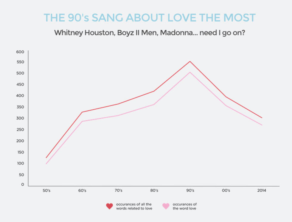 I morgon är det Alla hjärtans dag och inför det har några studenter på Hyper Island tagit fram statistik över hur ofta musiklåtars texter innehåller ord kopplade till kärlek.Som synes i diagrammen här så var det under 90-talet som kärleken dominerade topplistorna som mest medan man på 50-talet inte sjöng särskilt mycket om kärlek. En trist trend verkar tyvärr vara att det sjungs mindre om kärlek och mer om pengar nu för tiden som synes i diagrammet ovan.Statistiken baseras på Billboards topp-100-listor från samtliga årtionden mellan 1950 - 2000 samt statistik för 2014 (då endast 95 låtar ingick i statistiken).Här hittar ni en låtlista med diverse kärlekslåtar som Hyper Island-studenterna tyckte passade bra inför Alla hjärtans dag.