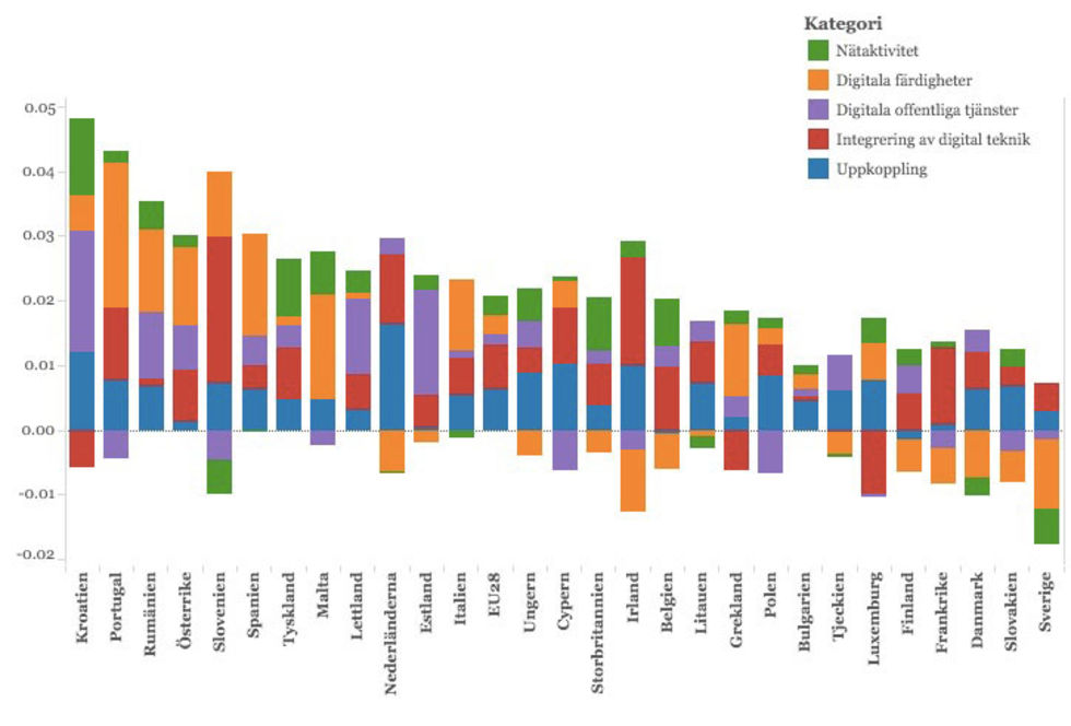 EU-kommissionen har sammanställt statistik över fem kategorier som återspeglar hur väl internet och digitala tjänster är utbyggda i respektive EU-land och Sverige tappar i den statistiken.Sverige toppade förra årets statistik men som synes i diagrammet ovan så har vi nu halkat ner till tredjeplats med både Danmark och Nederländerna före oss. Kommissionen säger i ett uttalande: "Sverige hamnar i klustret av högpresterande länder där utvecklingen börjar sakta in. Landets poäng är högre än EU-genomsnittet, men ökningen jämfört med förra året är lägre än genomsnittet." Som synes i diagrammet nedan har Sverige även backat på de tre områdena Digitala offentliga tjänster, Digitala färdigheter samt Nätaktivitet. Detta gör att Sverige sammantaget är det land i EU som backar mest på digitaliserings-området. Diagram: Europaportalen