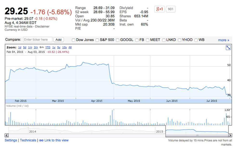 Efter Twitters rätt så misslyckade kvartalsresultat börjar nu investerare visa allt mindre tillit till företagets aktie vilket ledde till att aktien föll ytterligare över 5% på den amerikanska börsen igår.En aktie kostar nu 29,25 dollar vilket kan jämföras med de 26 dollar en aktie gick för när Twitter börsintroducerades i november 2013. När Twitter värderades som mest i januari 2014 kostade en aktie 69 dollar. Att aktien har rasat så mycket sedan senaste kvartalsrapporten beror framför allt på att tillväxten på mikrobloggen nästan helt avstannat och under det aktuella kvartalet lyckades man "bara" öka användarantalet med två miljoner personer. När Twitters aktie nu faller har det även börjat spekuleras om att företaget kommer att köpas upp av någon annan och det snackas om såväl Facebook som Google, Microsoft och Apple även om jag antar Google och kanske Microsoft antagligen är de enda som kan vara seriöst intresserade av att köpa tjänsten av dessa fyra.Nedan hittas en graf över Twitters aktieutveckling för det senaste halvåret. Interaktiv version hittas här.