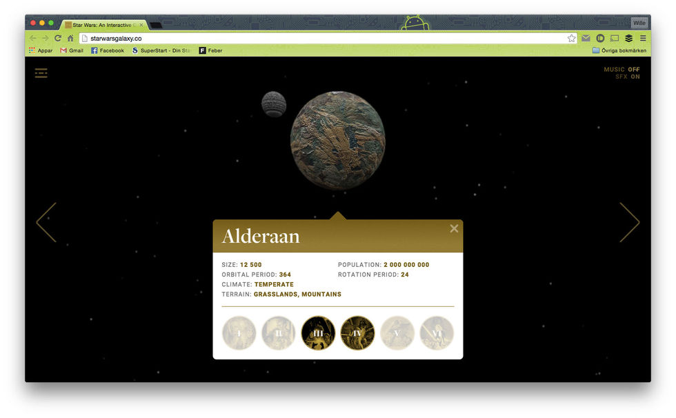 Skulle du vilja ta dig en närmare titt på himlakropparna som förekommer i Star Wars version av universum så finns det nu en interaktiv karttjänst som kan hjälpa till med det.Det handlar om ett 40-tal planeter och zoomar man in på var och en av dem så får man reda på hur stor planeten är, hur många som bor där, hur långt ett dygn på planeten är samt hur klimat och terräng är på planeten. Man får även veta i vilken eller vilka av Star Wars-filmerna planeten förekommer och det finns även en sorteringsfunktion där man kan sortera planeter efter vilken film de förekommer i.