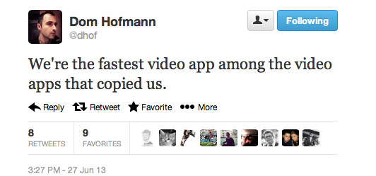 Det händer en del kring Twitters videoapp Vine just nu så här kommer tre snabba nyheter om tjänsten.Uppdatering för Android Vi börjar med en glada nyheten för androidanvändare. Om ni uppdaterar er app nu så kommer ni att kunna använda frontkamera för att Vine:a så dags för självporträtt!Skön tweet Som ni kan se här nedan så twittrade medgrundaren av Vine Dom Hofmann en liten pik mot att Instagram nu även har en videotjänst. Tweeten är sedan dess borttagen, den var nog aningen för bitter. Statistik För en månad sedan så skröt Vinte stolt över att att det delades fler Vine-länkar än Instagram-länkar på Twitter och sedan dess har det dessutom bara ökat så att Vine verkligen krossat Instagram vad gäller delningar på Twitter. Här om dagen så lanserade dock Instagram sin videotjänst och som vi kan se på diagrammet var det kanske inte en helt bra grej för Vine som sjönk rätt hårt.Vilken av de två gillar ni mest?